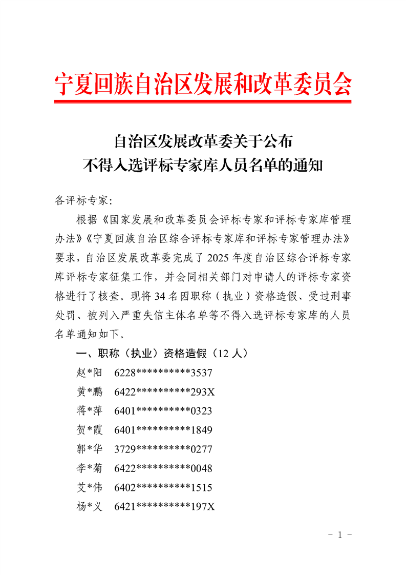 自治區發展改革委關于公布不得入選評標專家庫人員名單的通知