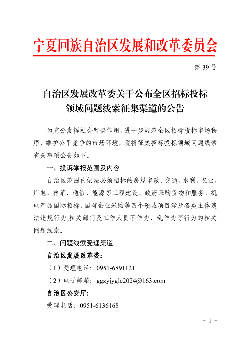 自治區(qū)發(fā)展改革委關(guān)于公布全區(qū)招標(biāo)投標(biāo)領(lǐng)域問題線索征集渠道的公告